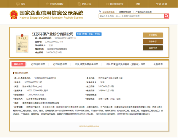 發(fā)布日期:2022-04-26 13:03 來源:江蘇環(huán)保產(chǎn)業(yè)股份有限公司 字體:[ 大 中 小 ] 一、工商注冊登記等企業(yè)基本信息