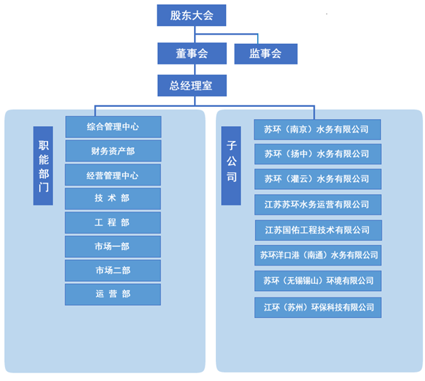 根據(jù)職能劃分,環(huán)保產(chǎn)業(yè)公司設(shè)置八個生產(chǎn)經(jīng)營及職能管理部門:綜合管理中心、財務(wù)資產(chǎn)部、經(jīng)營管理中心、市場一部、市場二部、技術(shù)部、工程部、運營部;下轄二個全資子公司、六個項目公司:江蘇國佑工程技術(shù)有限公司、江蘇蘇環(huán)水務(wù)運營有限公司,蘇環(huán)(南京)水務(wù)有限公司、蘇環(huán)(揚中)水務(wù)有限公司、蘇環(huán)(灌云)水務(wù)有限公司、蘇環(huán)洋口港(南通)水務(wù)有限公司、蘇環(huán)(無錫錫山)環(huán)境有限公司、江環(huán)(蘇州)環(huán)保科技有限公司。